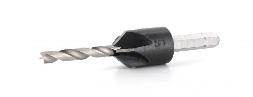 - Brad point drill bit fully ground with two main cutting edges, two taper taps and hexagaonal shank for bit-holder (1/4"; C 6,3). With assembled countersink product line 2100 (alloyed tool steel)