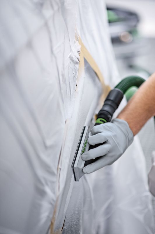 The extractable hand-sanding block is suited to sanding corners or difficult-to-access places on filler surfaces. The suction power can thus be optimally adapted through bypass adjustment. Thanks to the rounded-off corners of the burr layer, no damage is done to the surfaces to be processed. The ergonomic handle prevents blisters forming on your hands. Can be used with the Festool extractor hoses thanks to the integrated adapter.