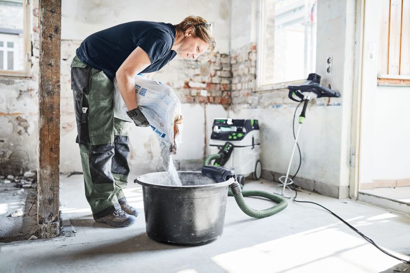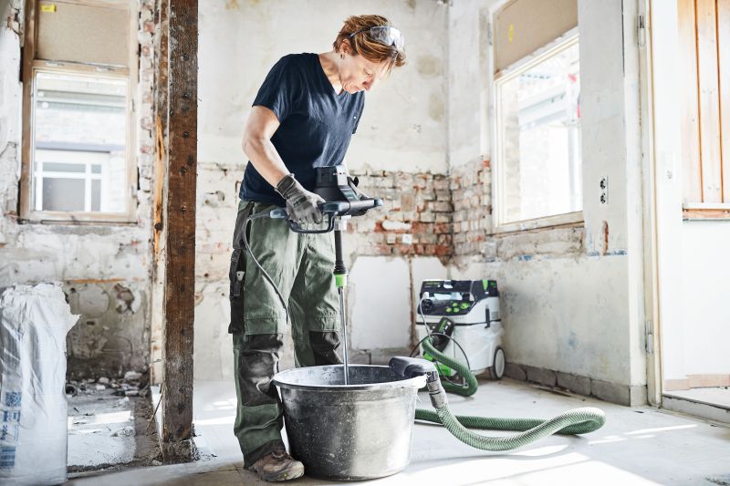 - Effective extraction: The Festool MX extraction system is simply clamped onto the edge of the mixing bucket so that the dust disappears into the extractor from the moment the mixing material is poured in. You no longer have to battle with clouds of dust while stirring. And after your work is done, the construction site is as clean as before, saving you valuable time.
