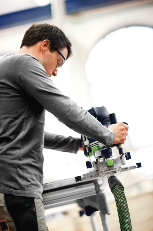 • Cleaner, healthier work: The new suction concept behind the Festool OF 2200 ensures suction power of up to 99%. The retractable extraction ring seals off the chip space when the router is used for plunge-cutting. However, the ring can be locked in place on top for a perfect view of the scribe mark. The chip deflector can be rotated 360° and ensures maximum suction power.