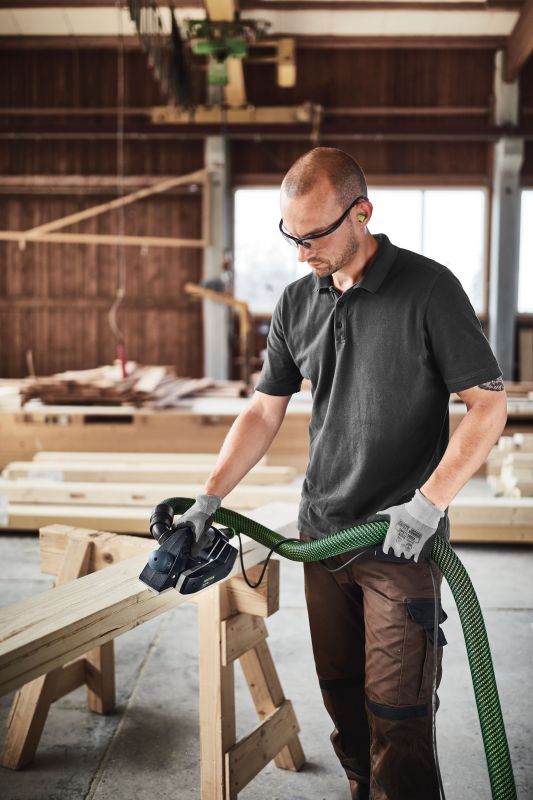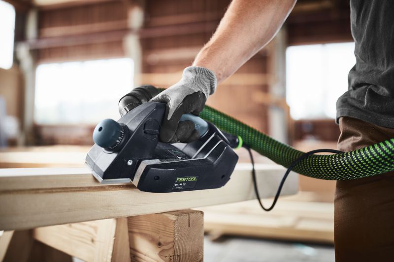 Weighing just 2.4 kg and with a compact design, the Festool EHL 65 one handed electric planer is not only the lightest and lowest one-handed planer in its class, but also the most powerful. 4 mm planing and 23 mm rebate depth and excellent surface finish thanks to the unique spiral blade with pulling cut. With SoftGrip handle and cutting depth adjustment, single-button operation and non-slip ridges on the housing for a secure hold. This means that the Festool EHL 65 planer can be guided effortlessly, whether it's horizontally or vertically, with one or two hands, with the left hand or right hand. In short: It's ergonomic. Fast. Precise. The one-handed planer for professionals.