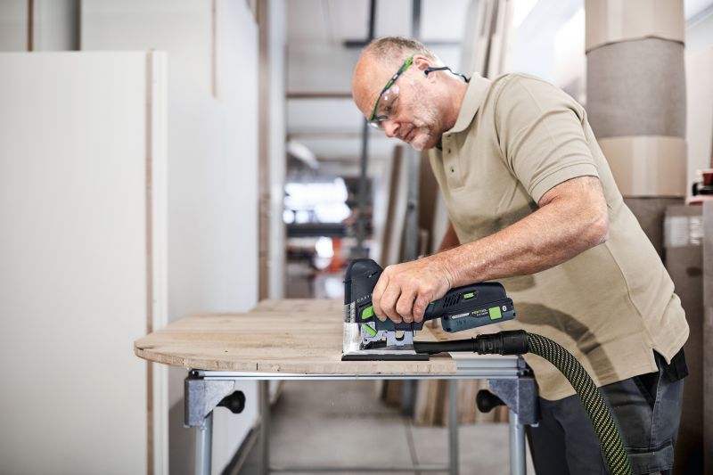 With the Festool CARVEX PSC 420 cordless pendulum jigsaw, even tight curves feel like straight lines. With 3800 strokes per minute, the high-performance, energy-efficient EC-TEC motor gives you powerful, fast sawing progress every time. Always guaranteed: Utmost precision thanks to the specially developed hammer guide and the guidance jaws featuring parallel adjustment. They act as a third guide to keep the saw blade on track with no compromises. The fact that top performance does not merely relate to sawing results is also shown by the ergonomic design of our cordless pendulum jigsaws, which enables you to work tirelessly for sustained periods. The Festool Bluetooth® battery packs ensure particularly convenient use of the Festool mobile dust extractor: In combination with a Bluetooth®-compatible Festool mobile dust extractor, they ensure that the extractor starts automatically in AUTO mode when the Festool cordless pendulum jigsaw is switched on.