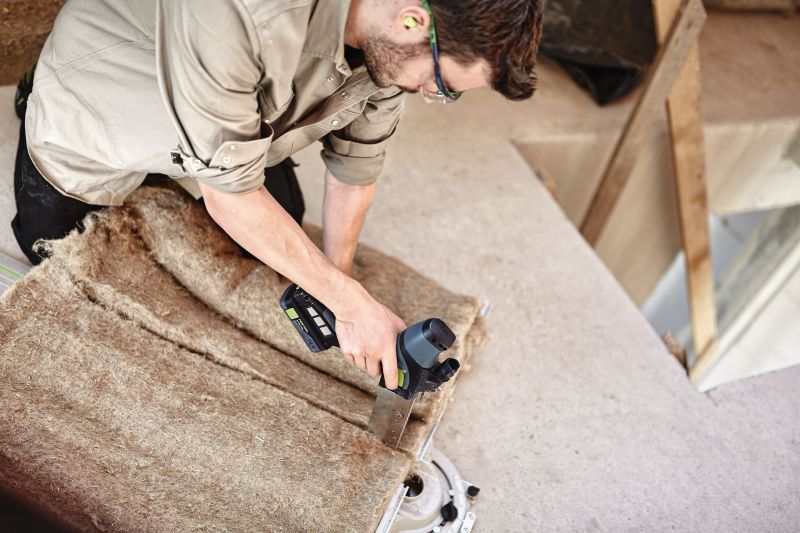 No matter whether freehand or guided with guide rail and stop system, whether working on roofing, scaffolding or flooring, with insulating material made of mineral fibres, natural fibres or PUR insulating boards – the Festool ISC 240 impresses with its mobility, versatility and efficiency, making it the optimal solution for anyone wishing to insulate housing with minimum effort.