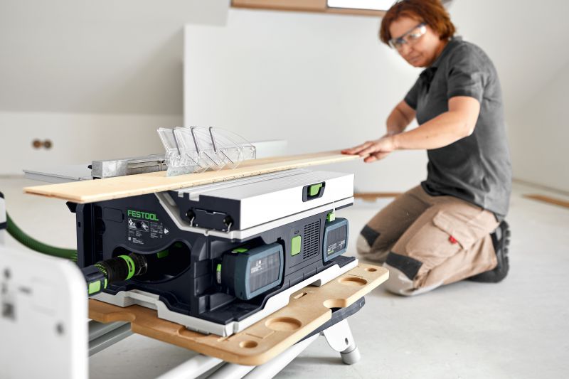 - puts the CSC SYS 50 cordless table saw at a working height of 90 cm (with legs folded out)