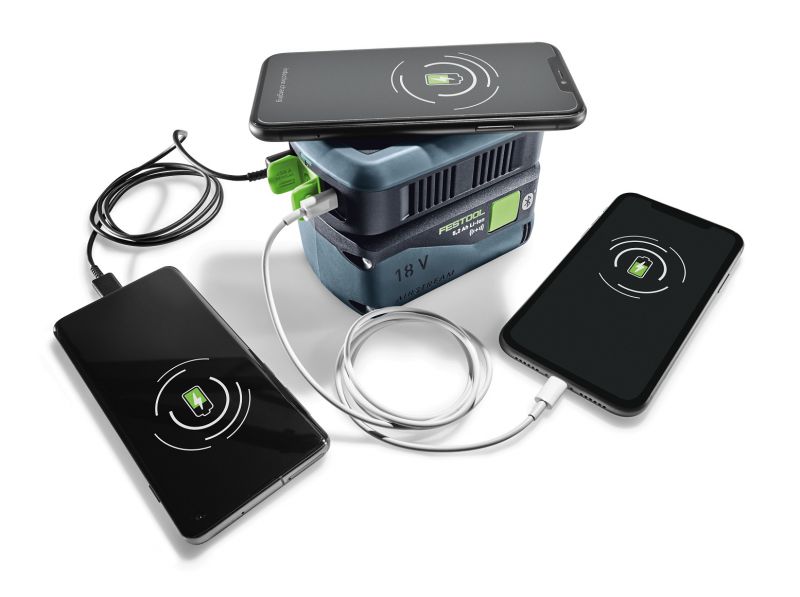 - Works with any Festool 18 V battery pack: It doesn't matter which Festool 18 V battery pack you currently have to hand – the PHC 18 phone charger can turn them all into a power bank (excluding 3.1 Ergo battery packs). Just like with a cordless tool, simply position the smartphone on the charged battery pack and the smartphone will be supplied with power.