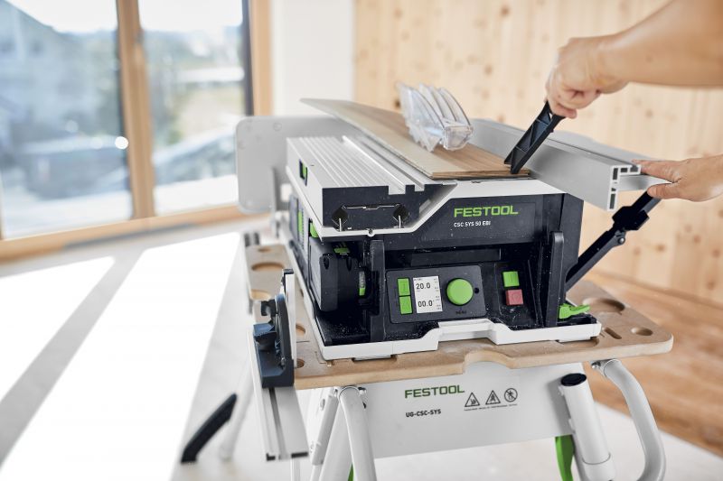 • The perfect pair: Underframe and CSC SYS 50 cordless table saw. The UG-CSC-SYS underframe is ideally tailored to use with the CSC SYS 50 cordless table saw. You position the CSC SYS 50 securely on the worktop via suitable holes – and raise it to an ergonomic working height of 90 cm. The "shovel" of the underframe offers a secure contact surface for rip and cross-cuts (especially for long workpieces).