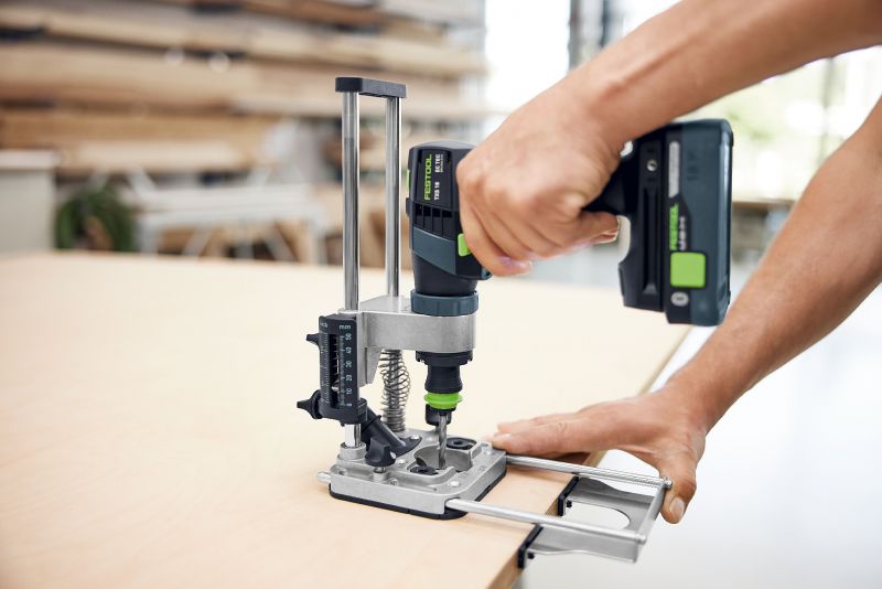 The MB 40 mobile drilling attachment is your companion when precision is required. As a compact drilling aid, it enables you to drill at right angles with pinpoint accuracy and repeat accuracy, no matter where you are working. Versatile stops and exact depth adjustment are available as options, so that you can drill vertical holes, end face holes and a series of holes. For a good view of the drilling point, you can couple the dust extraction directly with the base plate. As a further FastFix attachment, it is ideally suited to your drilling applications in wood, metal and plastic, thus expanding the range of possible uses for your Festool cordless drills.