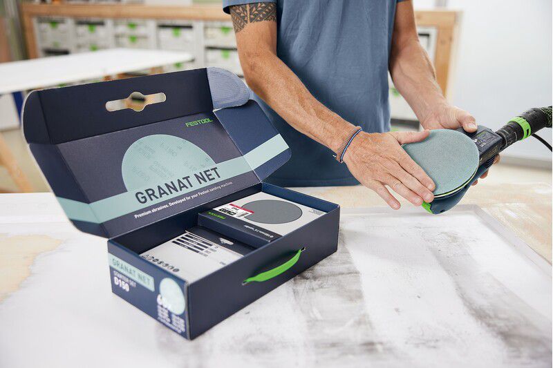 GRANAT NET is the ideal mesh abrasive for surfaces that produce a lot of dust. With a wide selection of grit sizes from coarse to fine, GRANAT NET provides you with optimum support for a wide variety of applications – for flawless results. Thanks to the open mesh structure, GRANAT NET ensures extraction of the sanding dust across the entire surface. This keeps your workplace clean and your health protected. The linear arrangement of the grit particles guarantees maximum material removal and constant sanding performance – even with intensive use. The stable mesh structure is tear-resistant, has stable edges and offers you a long service life. With 10x GRANAT NET sanding discs each in grit sizes P60, P80, P120, P180, P240 and P320 and the appropriate protection pad, the GRANAT NET D150 starter set is the perfect addition to your sander. The included protection pad ensures an optimum connection between the sanding pad and GRANAT NET – this protects your fastener from wear and dirt and ensures the perfect hold.