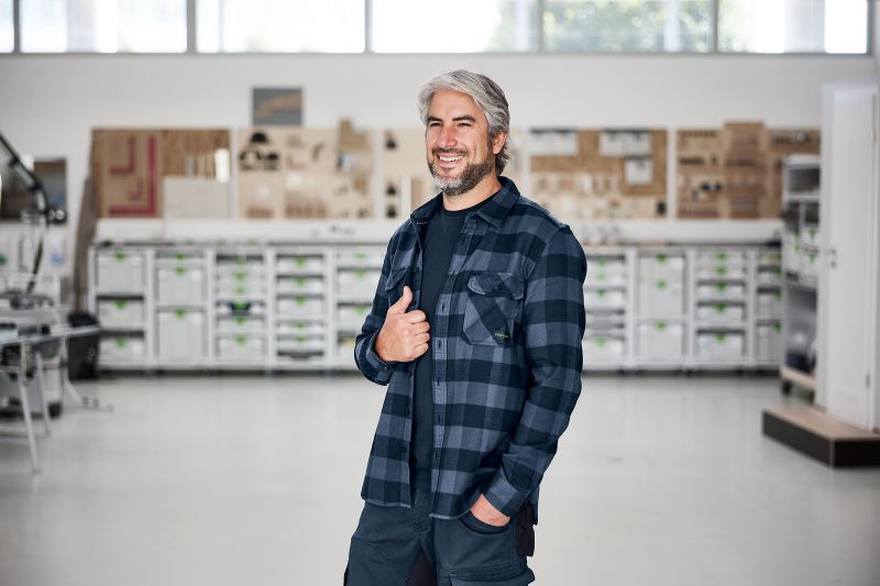 - "Twoface" weaving technique: Outside of shirt checked, inside plain dark blue