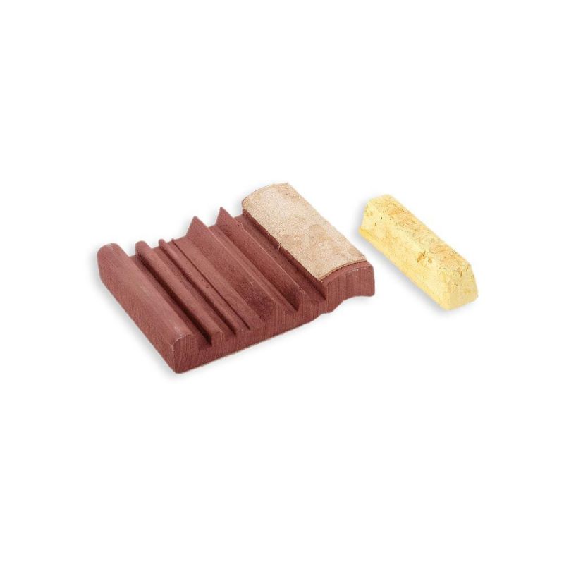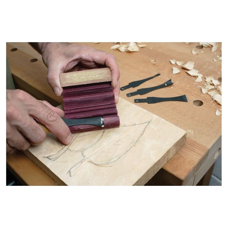 - Flexcut SlipStrop: Produced for honing and maintaining the edges on both the inside and outside of gouges and vee tools, the Flexcut SlipStrop consists of a complex moulding with two areas of leather and a bar of a specially developed honing compound. The compound is available separately for those wishing to use it on their existing strop. In use, the particular part of the moulding most suited to the chosen tool is rubbed crayon-like with compound and the tool stropped. A mirror finish is achieved quickly, and the resulting razor edge can be maintained by repeating the process many times before resharpening is required. Use for gouges and vee tools both inside and outside.