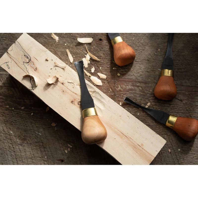 - The comfortable cherry wood handles have a brass ferrule for added strength. A small flat on the back of the handle prevents the tool from rolling off your bench.