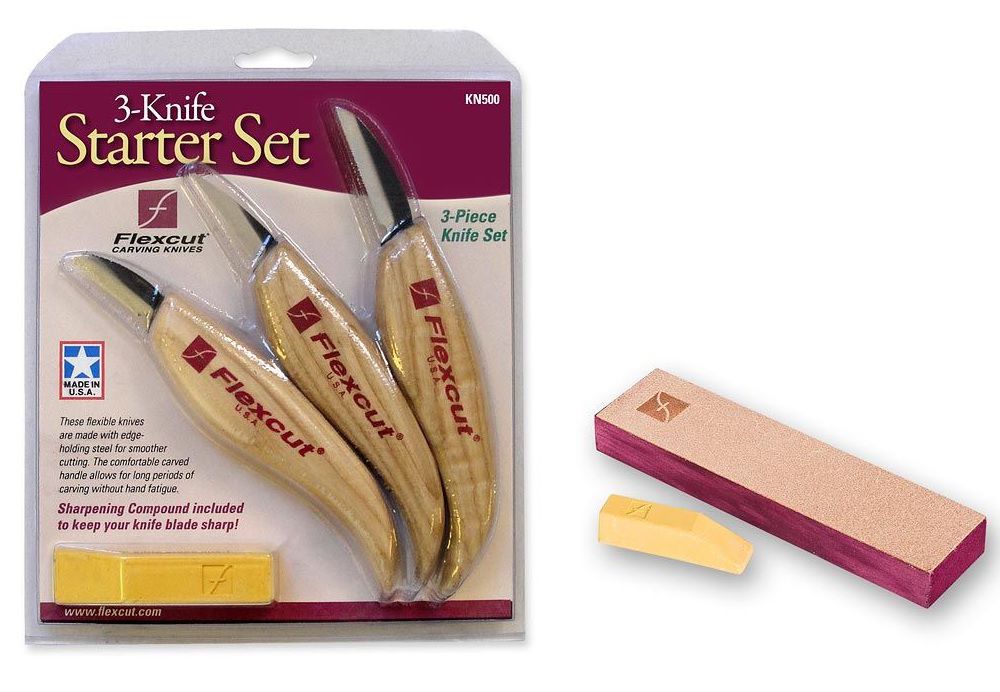 • Flexcut Starter Knife Set: This is the perfect package to get you started carving with knives. These knives have all the same edge-holding properties as their gouges and chisels. They come honed and ready for use. Their comfortable curved ergonomic handles allow for long periods of carving without hand fatigue. Set includes Cutting Knife (KN12), Detail Knife (KN13) and Roughing Knife (KN14) and a block of polishing compound to maintain a razor edge.