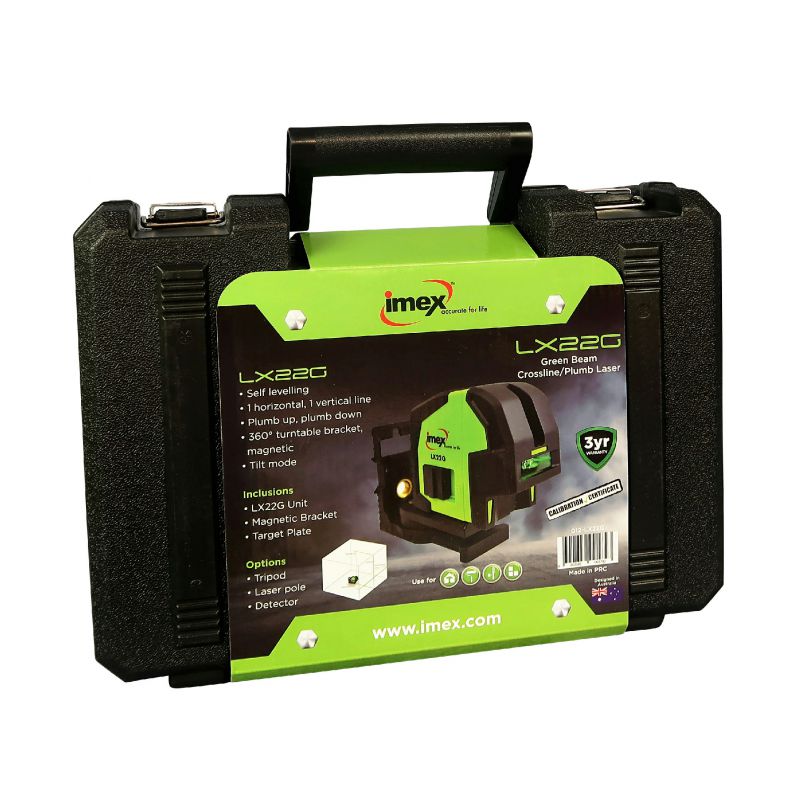 The Imex LX22 Green Beam Crossline Laser Level projects sharp, bright lines across any room with a high level of accuracy. Features include a locking pendulum, which is both a very important safety feature to protect the integrity of the laser level and a useful feature for projecting lines out of level when needed. The LX22 represents incredible value for money and is perfect for any tradesperson or serious DIY enthusiast who is looking for a professional line laser at a low price point.
