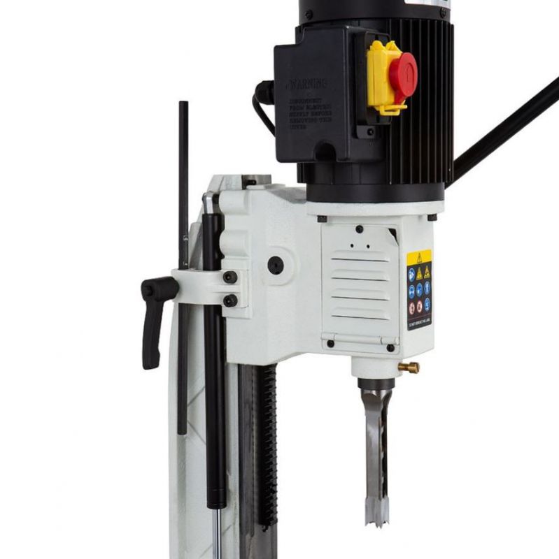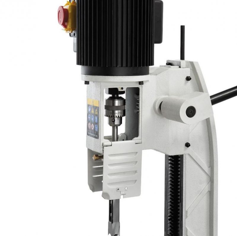 - A professional floor standing mortiser with heavy-duty cast iron table and lockable stand for storage of chisels, bits and service tools. The powerful 1,3 kW motor allows you to produce 25 mm wide mortices. Table travel is ensured by two wheels, one for longitudinal and a second for traverse motion. The dovetail slideways ensure smooth movement in both directions with lock on the fore and aft setting. Accurate stops ensure a high-precision placement of mortise on the worked piece. The surface of the table is made out of MDF, the desk also has a steel ruler and a quick to set up length stop for mass production. Along the back of the main table is a mortice length setting device which along with the stops allows a quick and accurate mortise. The engine and chuck weight is balanced by a hydraulic piston. The up and down movement is limited by two stops, which you can pre-set. The hollow chisel bit can be affixed into two bushings either 19 mm or 20,6 mm. The auger bit is affixed in a 13mm chuck. Head rotates 180° for excellent door lock morticing without complicated handling.