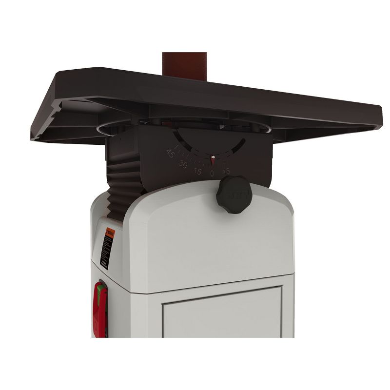 - The large cast iron table can be angled forwards by 45° and backwards by 15° and features a 90° locking position