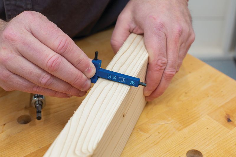 - Foolproof setup with a material-thickness gauge, positive stops, and easy-set drill bit and stop collar