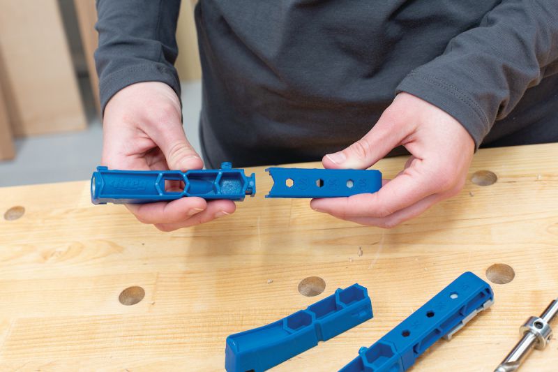 - Convenient variable pocket-hole spacing with twist-apart drill guides and removable spacers