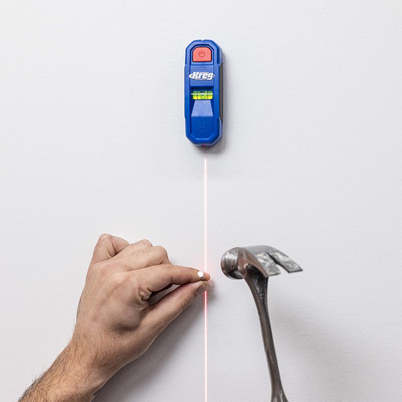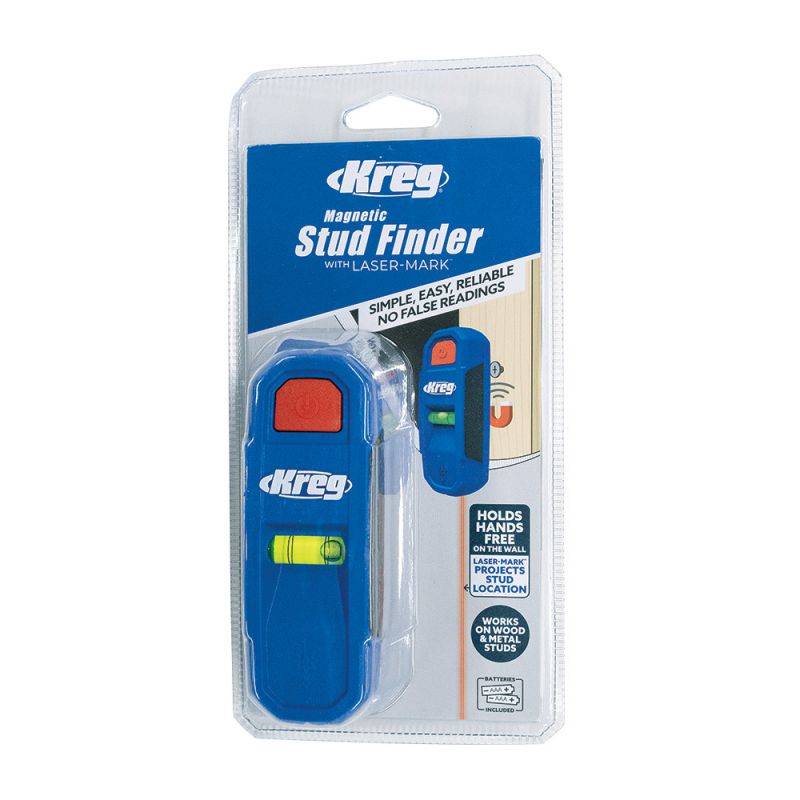 - With a simple and intuitive design, the Kreg Magnetic Stud Finder with Laser-Mark™ is a pocket-friendly way to hit the mark every time. Featuring strong rare earth magnets, the Magnetic Stud Finder with Laser-Mark™ offers reliable indication on wood and metal studs. Laser-Mark laser line, hi-viz bubble level, and precision marking notch make it easy to anchor cabinets, shelves, and more without the need to mark on the wall.