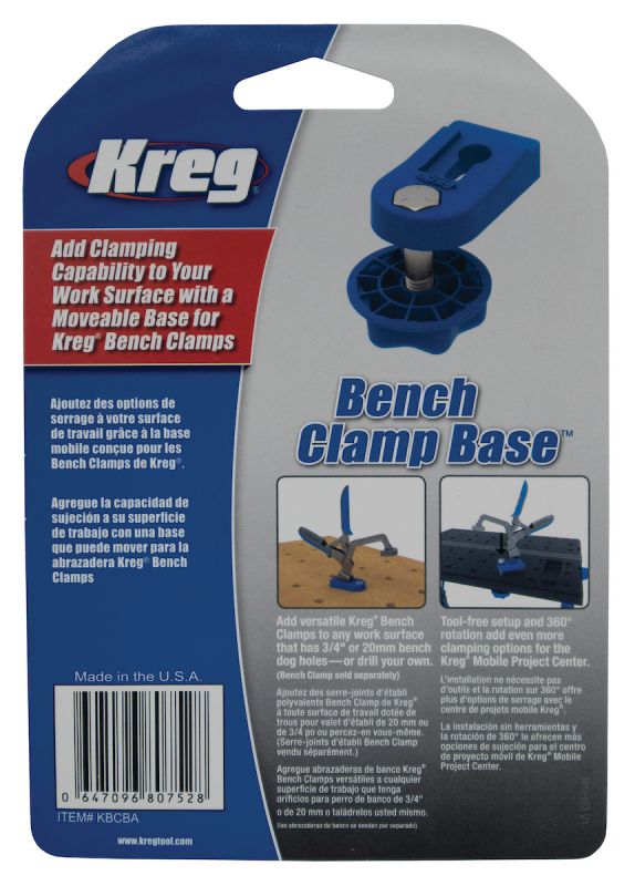 - The Bench Clamp Base is a perfect companion to the Kreg Mobile Project Center, and it allows you to get more from any work surface that’s equipped with 3/4" or 20mm bench dog holes. Or, you can simply drill a hole in any work surface, and easily attach the Bench Clamp Base, and just as easily remove it when not in use, or move it to another location.