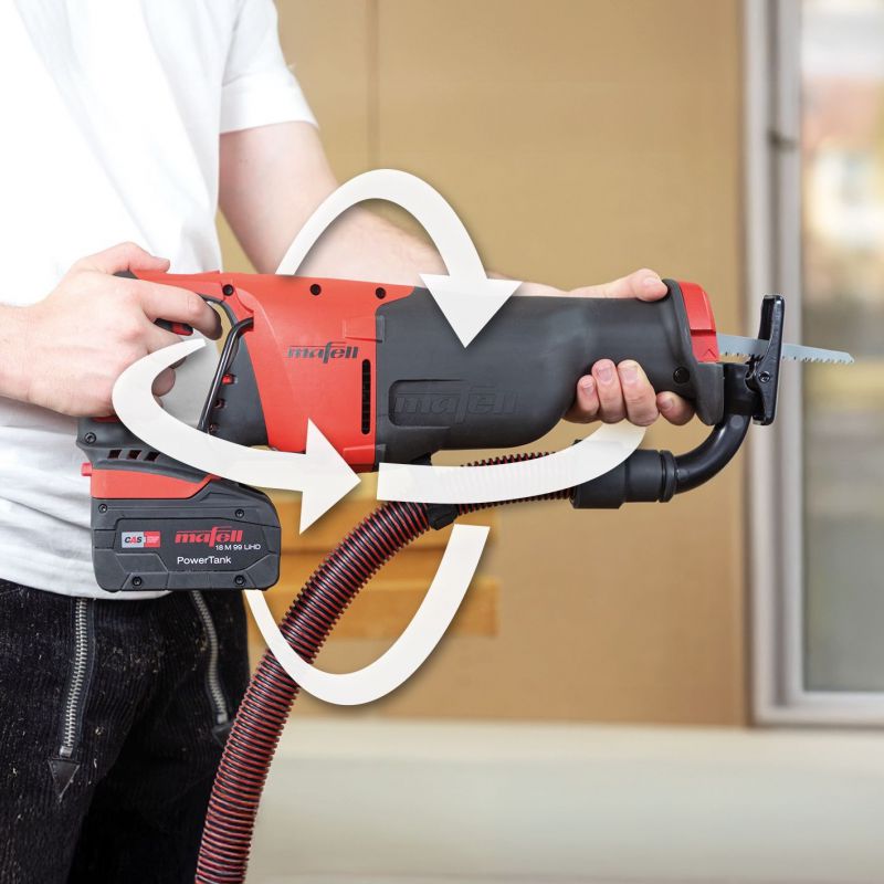 - Thanks to the universal chuck, the blade can be rotated through 180° (with the teeth pointing upwards).