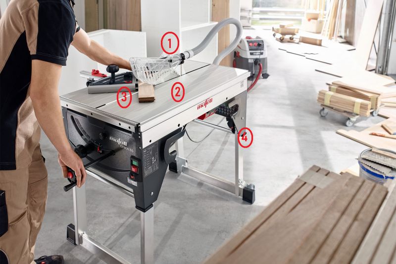 Extremely stable table profile, tilt range from -3° to 48° , lowerable riving knife and maximum cutting length of 430 mm (16 15/15 inch).