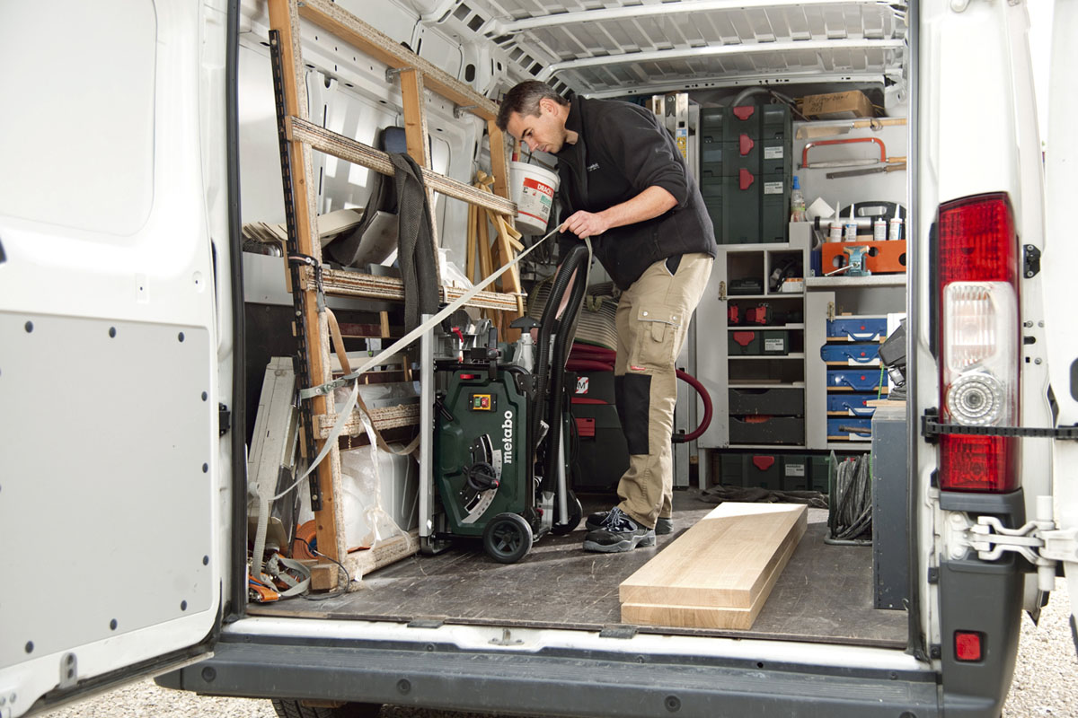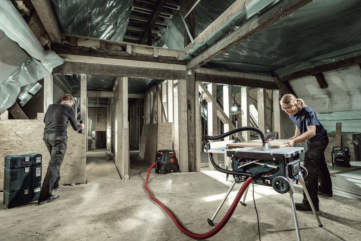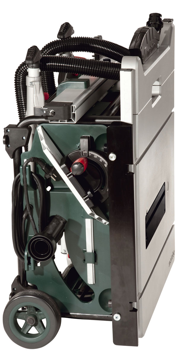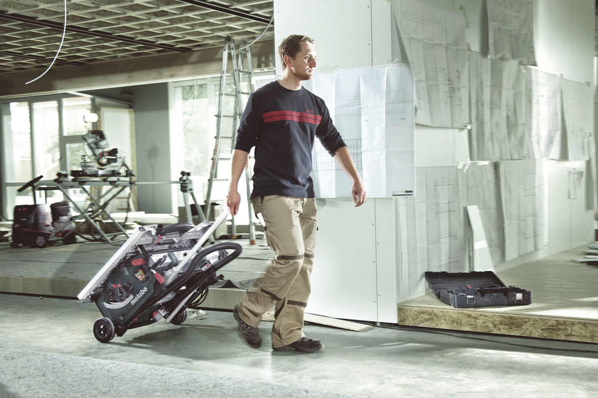 Extremely light Metabo table saw with trolley function for more mobility on the construction site.