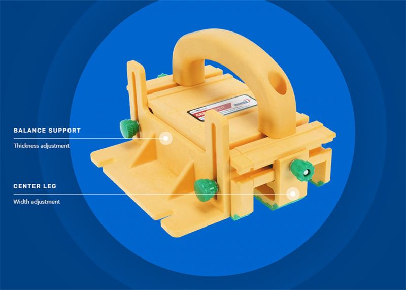 Fully Adjustable. Center Leg: Adjusts to varying material widths, allowing you to control both the keeper and off-cut sides of your workpiece through the entire cut. Balance Support: Adjusts to match material thickness, keeping the GRR-RIPPER® upright and square.