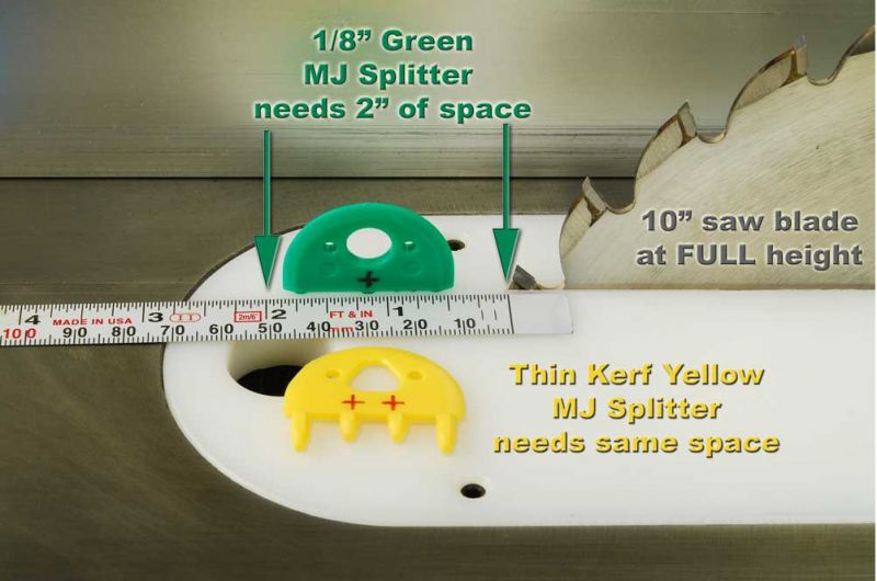 The MJ SPLITTER easily installs on your table saw’s zero clearance insert, replacing the riving knife. It keeps your workpiece tight to the fence to prevent burning, and keep the kerf from pinching the blade, virtually eliminating kickback.