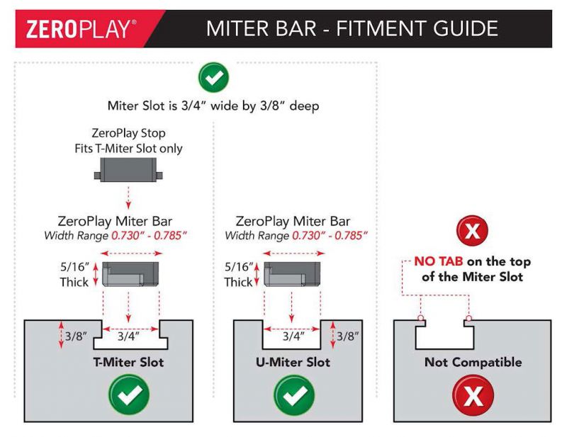 - ZEROPLAY Miter Bars will fit any standard (3/4” x 3/8”) miter slot that measures between 0.73" and 0.79" wide and is at least 5/16" deep. *Not compatible with table saws with tabs cast into the top of the miter slot or 5/8" miter slots i.e. Ryobi or Craftsman*.