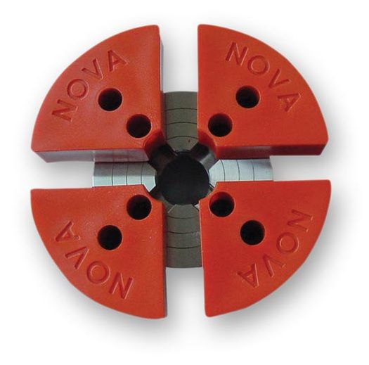 The NOVA Soft Jaws Set consists of four quadrants of high quality nylon. These jaws are easy to shape using standard turning tools. This allows the user to make a customised set to suit a specific project. The design allows woodturners to make up a special set of jaws for a job and store them away with any jigs and templates etc. In addition to turning, other customising options include sawing, drilling or tapping. There is plenty of usable material with which to shape a chosen profile. The diameter is 120mm, with an overall depth of 27mm, with 22.5mm available depth above the fixing screws. This gives the turner a great deal of flexibility over what they can do.