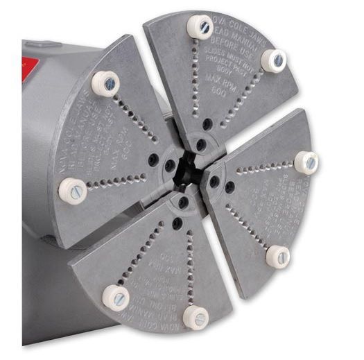 The NOVA Cole Jaws are versatile jaw sets that allow the woodturner to re-chuck bowls in order to remove a foot or recess formed when initially turning the object. Once reversed the turner is able to add decoration or to re-shape the bottom of the bowl. Using either of these jaws gives the opportunity to produce work with a smooth even curvature both inside and out. Standard Cole jaws are suitable for lathes with a minimum 300mm swing diameter. Mini Cole jaws are suitable for lathes with a minimum 200mm swing diameter. Cole jaws have many advantages over vacuum chucking to achieve the same end. It is possible to further extend their usefulness by adding customised wooden jaw segments.The standard Cole jaw has a maximum external grip 236mm and internal 280mm, whilst the Mini Cole will grip externally to a maximum of 170mm and internally 215mm. The Mini Cole jaws are best suited to the CometII lathe.