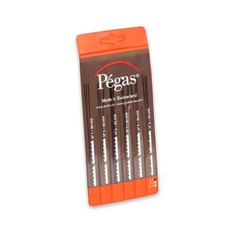 - The Pegas Wood Scroll Saw Blade Starter Pack consists of 18 x 130mm plain ended blades: 3 each of No.1, 3, 5 and 7 skip blades, and 3 each of No.3 and 5 variable geometry blades.