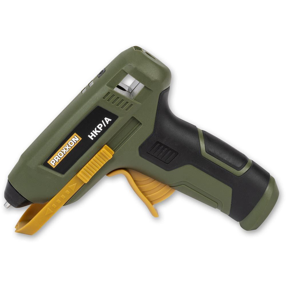 - Stick anytime, anywhere; no trailing cables to tie you down; this cordless glue gun is as handy as they come. The 2.0Ah battery gives you sufficient operating time to complete even larger projects. The HKP/A takes little time to come up to temperature and is electronically controlled to maintain an exact 170°C. It takes standard 7mm diameter glue sticks (supplied with 4 x 100mm sticks) and has a sensitive feed for greater control. The glue sets within 30 seconds. Use it to bond: metal, wood, plastic (also Plexiglas), glass, ceramics, earthenware, cardboard, leather, foams and textiles. The HKP/A is supplied with an integrated stand and a USB cable for charging. N.B. Requires a charging output of at least 2.1amp.