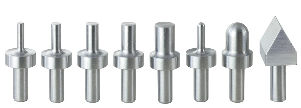 - With 5 cylindrical pressing tools (surface hardened) being inserted into the toothed rack and fixed with a knurled screw: Ø 3 - 4 - 5 - 6 and 8mm. One each semi-spherical profile Ø 3 and Ø 9mm as well as a 60° square prism for bending sheet metal. The counterpart is an easily adjustable, hardened revolving plate with all required holes and bottom dies for the above-specified pressing tools.