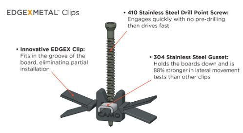 - METAL SUBSTRUCTURE DESERVES THE STRONGEST FASTENERS. EDGEXMETAL fits the bill. The clips utilize the same great innovative EDGEX clip design with a 304 Stainless Steel gusset that holds the boards down, reducing lateral movement. The key difference is that EDGEXMETAL features a 410 stainless steel drill point screw that engages quickly, boring a hole as you drive. It’s a clip that’s easy to set, fast to drive, and made to last.