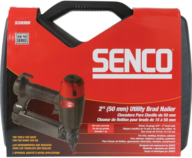 The S200BN pneumatic brad nailer drives 1.2mm (AX) brad nails from 16 to 50mm. With special features including the easy clear nose piece, soft rubber grip and reload indicator, it makes your job easier. Being part of the SemiPro range, this brad nailer is designed for light-duty, semi-professional and DIY applications. SemiPro tools feature restrictive trigger action for maximum safety and are covered by SENCO's 1-Year warranty.
