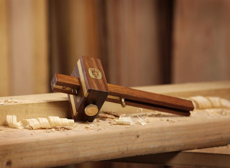 - Block : Rosewood Stained Hardwood with two brass plates on the working face, round brass bar through top section and brass lock screw on top