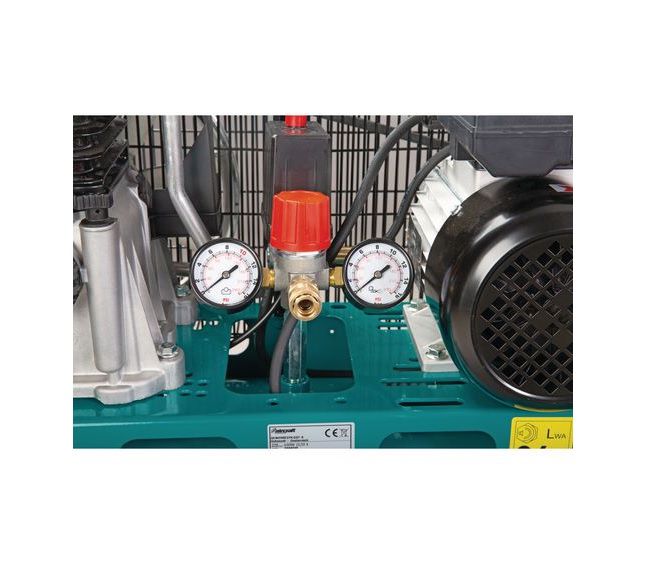 - Air receiver equipped with safety valve, receiver pressure gauge and condensate drain valve