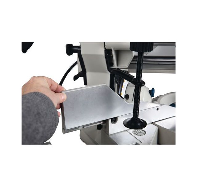 - Two-sided extension of the workpiece support with hinged stops for repetitive work