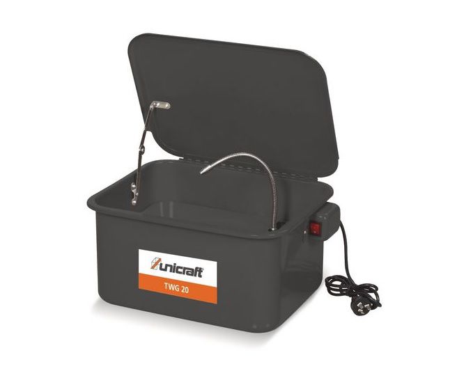 - TWG 20 Bench top auto parts washer + targetted cleaning/degreasing of parts by flexible hose + electric pump w 3.3 ltr min capacity + 10kg max weight of parts + 26W motor 230v