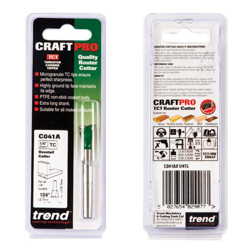 TREND C041AX1/4TC CRAFT PRO ROUTER CUTTER DOVETAIL CUTTER 104 DEG X 12.7MM DIA X 12.7MM CUT X 61.0MM O/L