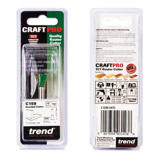 TREND C159X1/4TC CRAFT PRO ROUTER CUTTER DOVETAIL CUTTER 104 DEG X 14.3MM DIA X 12.7MM CUT (ELU/DEWALT/TITAN)