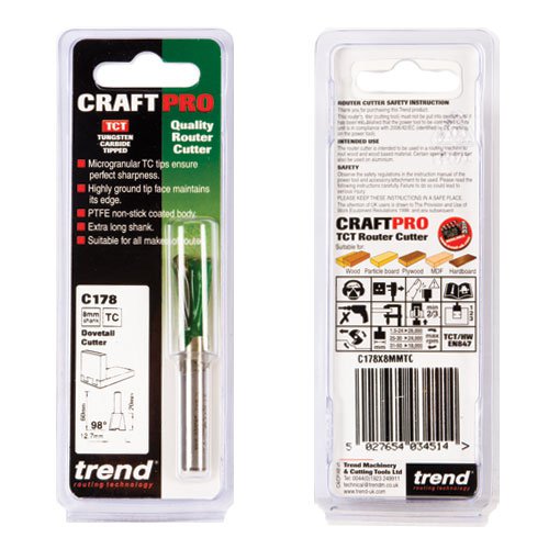 TREND C178X8MMTC CRAFT PRO ROUTER CUTTER DOVETAIL CUTTER 98 DEG X 12.7MM DIA X 20.0MM CUT