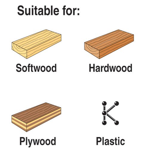 - Fast coarse cuts in hardwood, softwood, MDF, multiple glued wood and plastics.