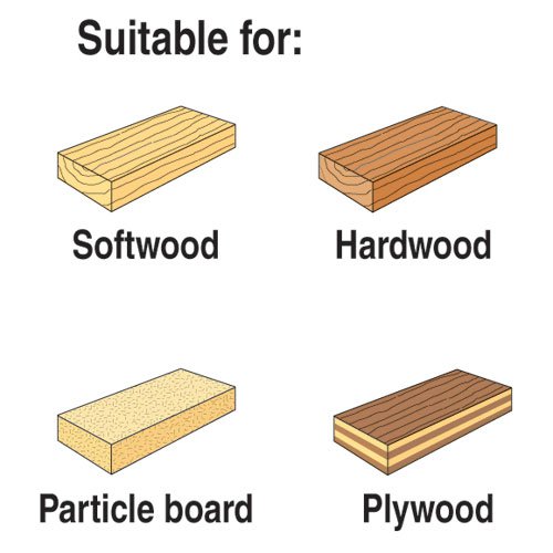 - High speed straight clean cuts in hardwood, softwood, kitchen worktops, MDF, multiple glued wood and particle board.