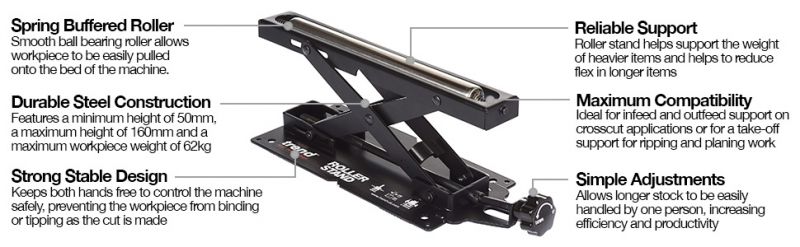 - Ideal for infeed and outfeed support on crosscut applications or as a take-off support for ripping and planing work