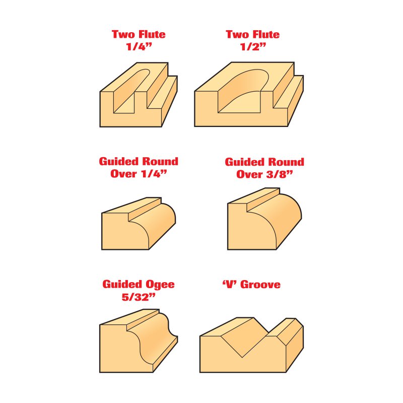 - The set contains three non-bearing cutters comprising 2 straight cutters, 6.3mm and 12.7mm diameter a 45¡ 'V' groove and three bearing guided cutters; 2 roundover cutters in 6.35mm and 9.5mm radii and a 4mm radius Roman ogee