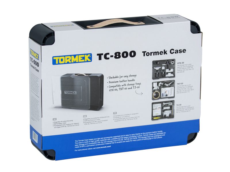 - The Tormek TC-800 case is purpose made to keep your jigs and accessories together. The case is made of high-quality, tough material. A transparent, sliding lid helps you quickly find the right jig or accessory. A strong leather handle makes it easy and comfortable to carry. The Tormek Cases are stackable for easy storage.
