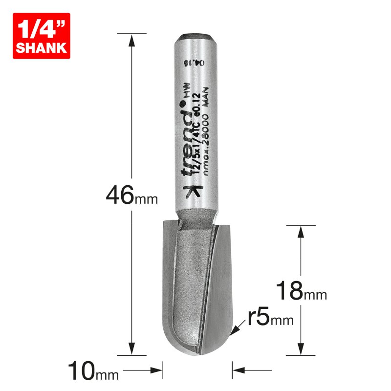 Trend 12/5X1/4TC Pro Cove Radius Router Cutter 5mm Radius x 18mm Cut x 1/4 Shank