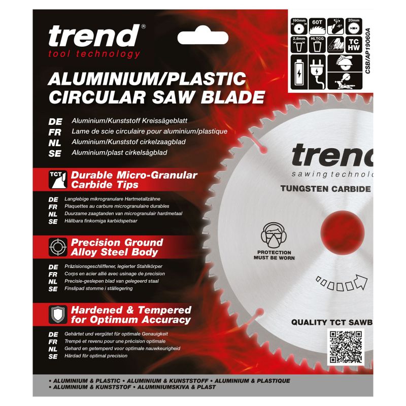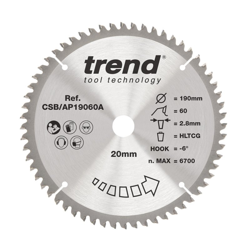 Trend Aluminium / Plastic Circular Saw Blade - 190mm dia x 2.8 kerf x 20 bore 60T